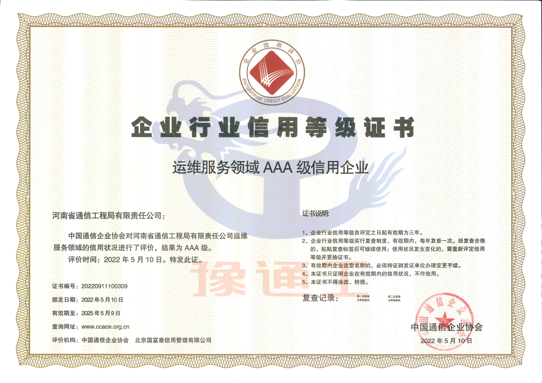 通信運(yùn)維服務(wù)領(lǐng)域信用企業(yè)AAA級(jí)