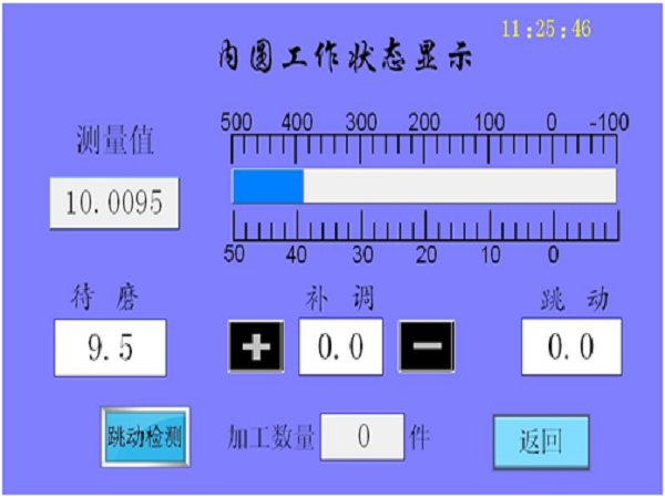 當各種數(shù)值都設定好后,在“加工中操作面板”點擊“啟動”按鈕,便進入自動測量狀態(tài)(儀器上電時自動進入)。外徑與內(nèi)徑對應不同的工作狀態(tài)顯示界面,分別如下圖所示: